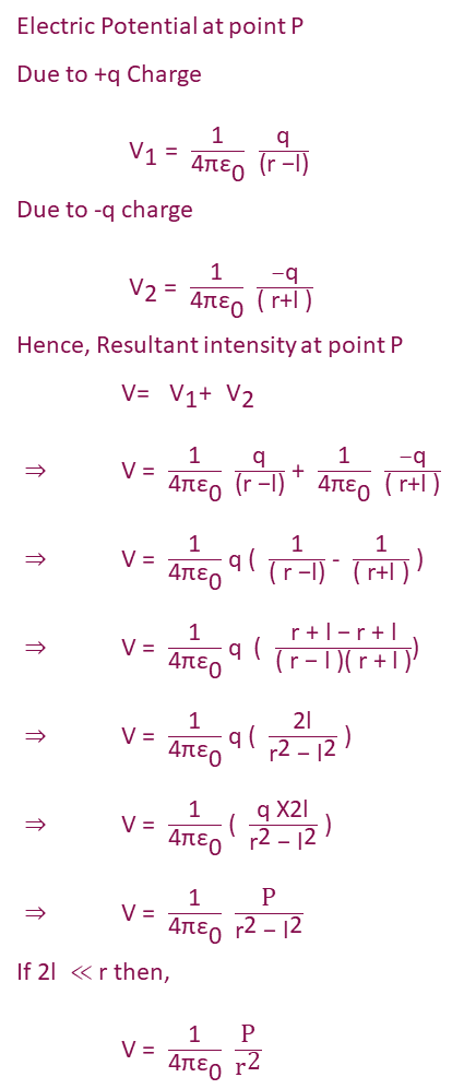 Let the point P be at distance r from the center of the dipole where electric potential is to be find out.
